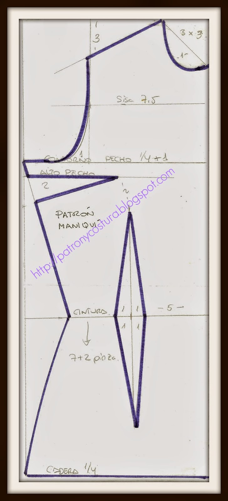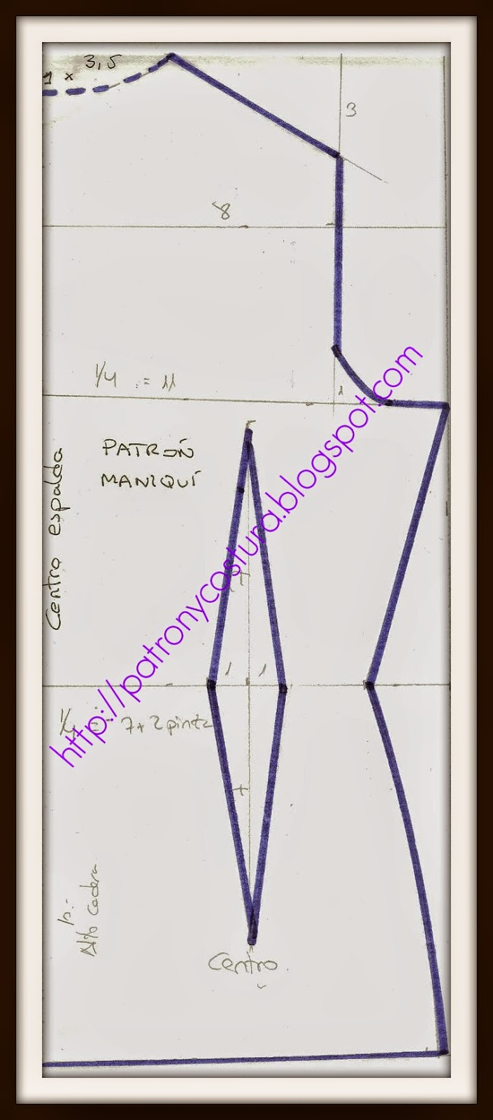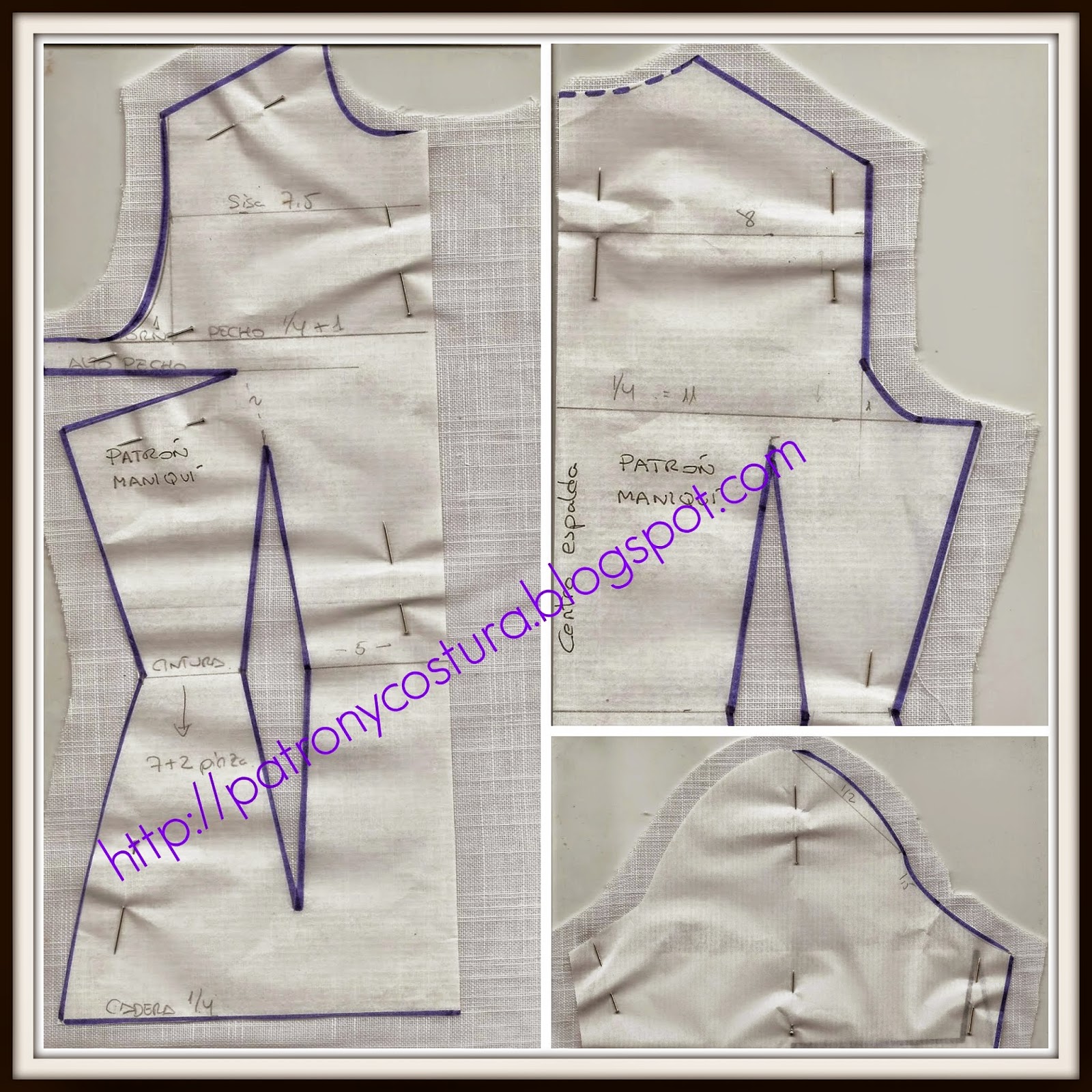 Ancho manga: 12SUGERENCIA para hacer un maniquí: UTILIZANDO ESTAS MEDIDAS hacemos los patrones base, la parte de delante sin añadir los 2 cm, es decir lo mas ajustado posible. Unimos ambos patrones y hacemos un maniquí de estas mismas proporciones, subimos el cuello tipo cisne y rellenamos con algodón sintético. Le colocamos una base y ya tenemos un maniquí para trabajar en él los cortes del curso y muy barato.Material necesario: papel manila, lápiz y regla para el patrón; 25 cm de tejido para la confección.Ahora tenemos presente la clase del patrón base de señora y aplicamos para confeccionar el patrón, teniendo en cuenta que para el maniquí ponemos 2 cm para las pinzas y 1 cm en el contorno de pecho de delante.