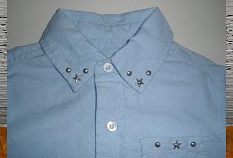 Elegimos un diseño y las vamos poniendo, sólo hace falta presionar la tachuela, dar la vuelta al tejido y doblar bien las puntas hacia dentro, yo en este caso las puse en cuello y bolsillo para que no entren en contacto con la piel, y muy pocas ya que al ser infantil no me gustaba muy recargada.