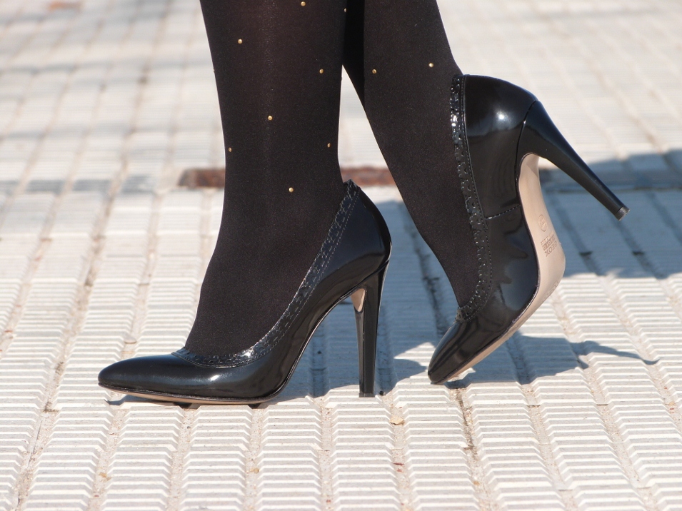 ¿Cómo va esa semana chicos? ¡Espero que muy bien! Yo sigo, como siempre, ajetreada, pero mientras tanto os quería enseñar algo de lo que me he comprado en las rebajas de Dolores Promesas :) Las fotos son del día de Reyes, ¡hacía un sol buenísimo! El look es muy básico pero tiene toques que me gustan mucho. Camiseta negra básica con letras con strass, mini falda de cuero, un toque con las medias de tachuelas y para romper un look negro, un bolso limón :)¿Os gusta?