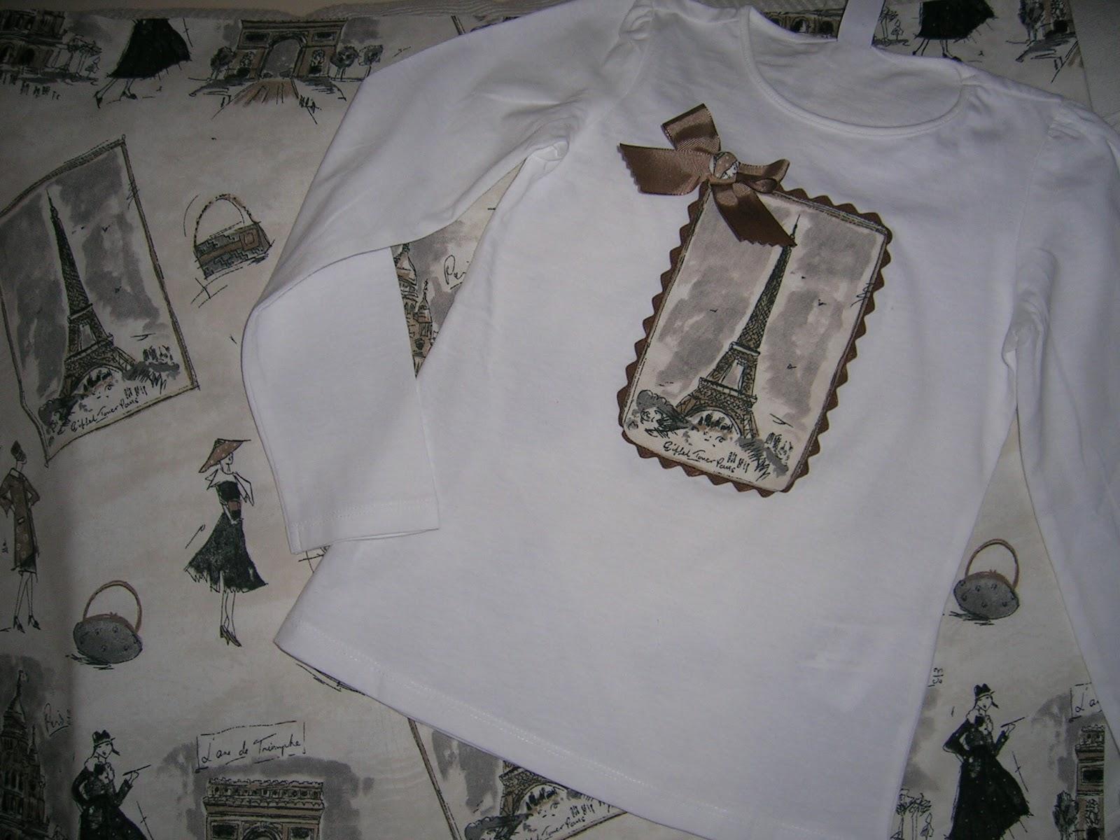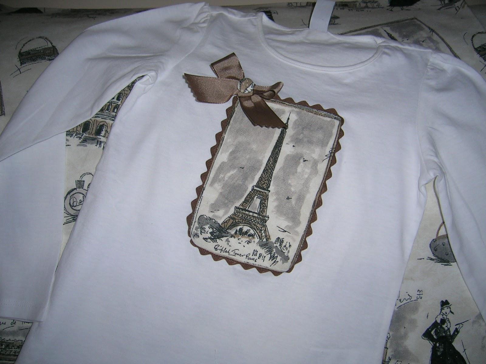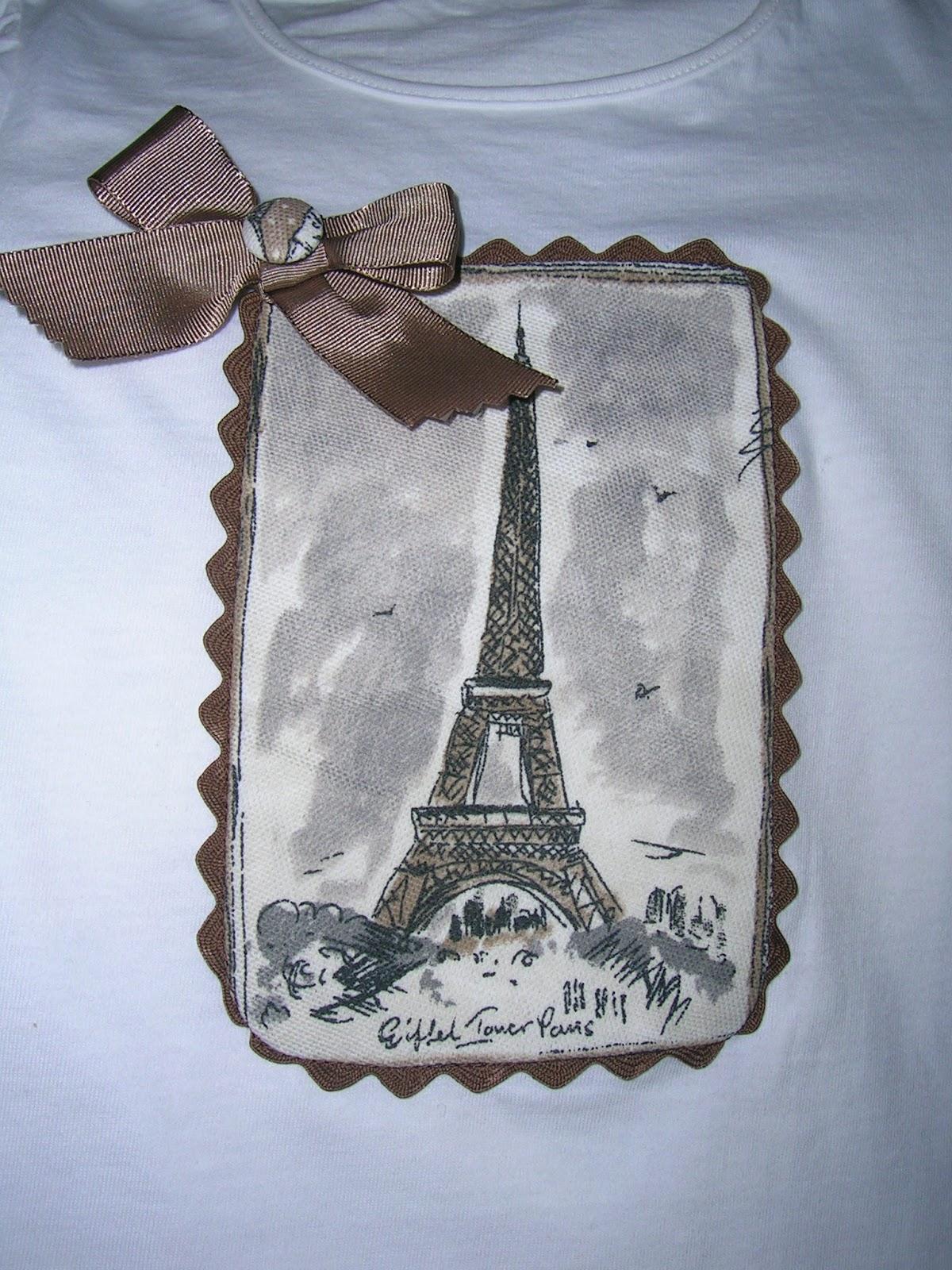 Y ahora, una foto del detalle de la aplicación con la Torre Eiffel. Como podéis ver, esta vez le ha añadido al lazo un botón forrado con la misma tela que adorna la camiseta.
