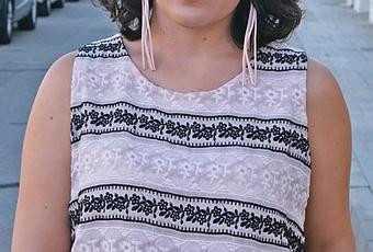 La blusa de este look es color rosa palo y lo original es el encaje que leva en la parte inferior. Y como complementos un bolso rosa con tachuelas y unos zapatos planos metalizados.