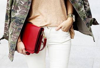 A perfect outfit for a Friday night out wearing white pants, nude t-shirt, camo jacket and laced sandals. Lately I like to add colorful accessories to get super fun outfits, in this case I love how works a red bag in a mix of neutral colors, do you like it?