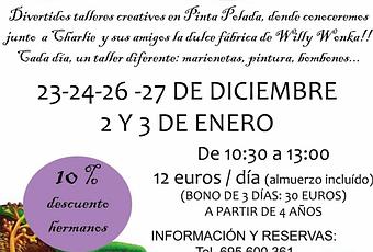 A través de la lectura del clásico infantil escrito por Roald Dahl, y de la película dirigida por Tim Burton, realizaremos divertidas y dulces actividades para disfrutar al máximo de las fiestas!! 23 – 24- 26 y 27 DE DICIEMBRE 2 y 3 DE ENERO DE 10:30 A 13:00 12 EUROS / DÍA (BONO DE 3 DÍAS: 30 EUROS) PROGRAMACIÓN: 23 DE DICIEMBRE-Dulces adornos navideños recién salidos de la fábrica de Willy Wonka!! 24 DE DICIEMBRE- Deliciosos bombones Wonka. 26 DE DICIEMBRE- Pinta tu personaje favorito. 27 DE DICIEMBRE-Divertida marioneta Oompa Loompa. 2 DE ENERO- Diseña tu tarjeta dorada (incluye dulce sorpresa). 3 DE ENERO- Super maqueta de la fabulosa fábrica de chocolate. Información y reservas: [email protected] Tel. 695 600 361Vía: Pinta Polada