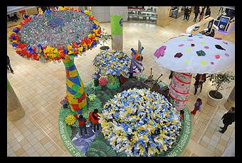Luego, los visitantes podrán disfrutar de imponentes jardines elaborados con material reciclado, los que vestirán las plazas centrales de los malls. Por ejemplo, en Mall Plaza Oeste habrá uno con dientes de león elaborados con estructuras de paraguas, plumeros y pelotas de pingpong; habrá chanchitos de tierra hechos de caucho, acero y bolsas plásticas; también arbustos de botellas recicladas y plantas decorativas de virutillas.