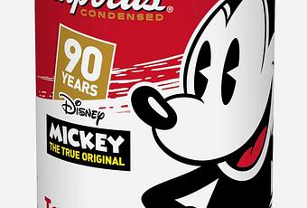 No solo la lata de sopa Campbell es un ícono global desde que Andy Warhol la pintó en 1962, sino que la compañía tiene 150 años de antigüedad. Esto quiere decir que ha vivido todas las etapas de Mickey, desde su aparición como reemplazo del conejo Oswald hasta hoy. Y por eso han renovado sus latas con tres diseños diferentes que incluyen una ilustración de la estrella de Disney en tres momentos de su vida, con sus claros cambios faciales.