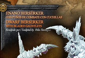 Lo que nos trae es una figura de Enano Bersérker,armado con dos puños de combate con cuchilla.Una figura puramente gladiatorial que en cierta forma se echaba en falta en este juego.Si bien las figuras estan geniales y te sirven entre otras cosas como personajes fabulosos para otros juegos,al ser figuras para un juego de luchas en una arena yo sentía que faltaba algo mas...pues eso,de gladiador.Y esta figura tiene ese aspecto con esos "cestus" con filos.Me gusta la postura,que transmite dinamismo y ferocidad y como esta esculpida(Obra del propio Felix),aunque las cuchillas las veo demasiado curvas para gusto.