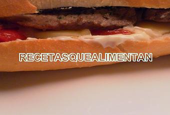 2 panes, 2 filetes de ternera, 4 lonchas de bacon (opcional), 4 lonchas de queso, un pimiento, 2 dientes de ajo, mantequilla, mayonesa, aceite de oliva, pimienta negra molida y sal.