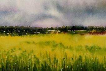 Acuarela de campos de colza en el nordeste de Salamanca, tierra cerealista y esteparia, en la que el horizonte se pierde entre los pardos surcos interminables y el limpio cielo azul, roto por las nubes algodonosas de primavera. El amarillo de los campos de colza pone la nota de color en esta monotonía esteparia, en la que sobresalen los trigales verdes, así como los corros de pinos, y ocasionales grupos de encinas.