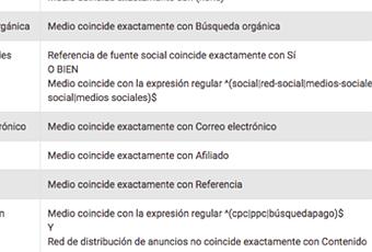 Esta es la dimensión más versátil; Google Analytics tiene predefinidos los canales principales de tus acciones de marketing, como puedes ver en el cuadro siguiente; sin embargo, también se pueden crear agrupaciones personalizadas.