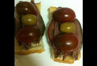Sobre pan tostado coloca una rodaja de tomate, unas anchoas, media aceituna y un tomate cherry partido por la mitad.