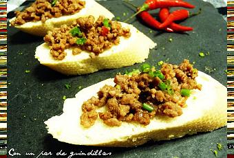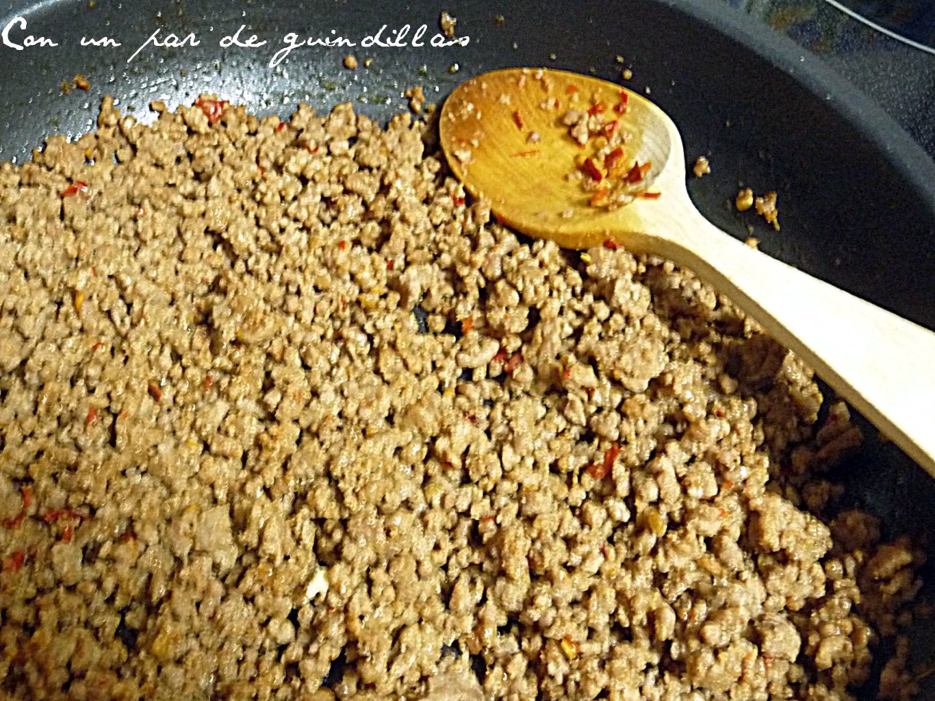 1.- Freímos la carne, añadiendo el azúcar, la soja, el zumo de lima y la pasta de guindillas. Tiene que quedar muy cocinada y muy sueltecita.