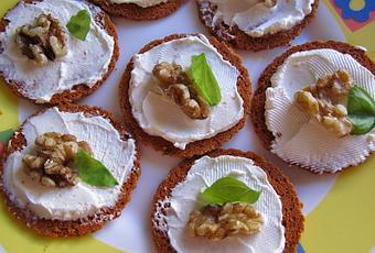 En esta ocasión usé las de tomate y con cuidado que son muy delicadas le puse queso de untar, media nuez y una hoja de albahaca de la maceta que he conseguido que brote.