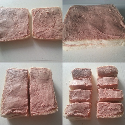 3. - Canapé de York: La misma operación que con las huevas , es decir, con mantequilla, y colocamos una loncha de jamón y cortamos. Para decorar, yo he utilizado trocitos de roquefort, podéis poner lo que queráis.