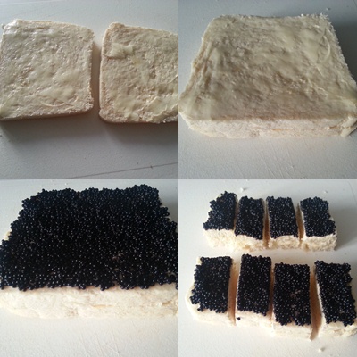 1. - Canapé de huevas de lumpo: Untamos dos rebanadas de pan con mantequilla y ponemos una sobre la otra, con la mantequilla hacia arriba. Sobre la mantequilla extendemos las huevas y cortamos la rebanada por la mitad, formando dos rectángulos, y cada rectángulo en 4 partes, primero por la mitad, y cada mitad en 2. Y decoramos por encima con un toque de mantequilla o mayonesa.