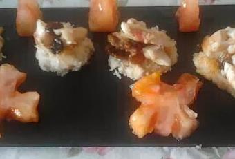 Yo lo he servido con una capa de arroz hervido, el paté ,trocitos desmigados de salmonete con unas pasas por encima y alrededor trocitos de tomate.