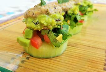 - Montamos los canapés, Primero colocamos una rodaja de pepino, encima una cucharadita de pico de gallo, de crema de aguacate y de atún falso. Decoramos con unas hojas de menta y refrigeramos antes de servir.