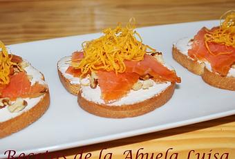 - Untamos las tostadas con el queso. - Partimos las nueces y las troceamos en trocitos pequeños, las disponemos por encima del queso. - Cubrimos con salmón. - Rematamos con un poquito de huevo hilado.