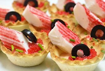 - En la fondo de las tartaletas, añadir un par de cucharaditas de salsa rosa. Colocar un trocito de surimi en el centro de la tartaleta apoyado sobre un lateral.