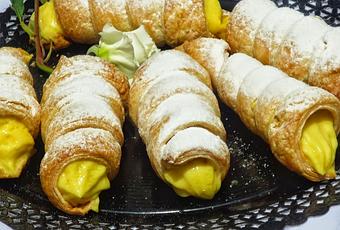 Rellenar con las cremas frías y espolvorear azúcar glas o pincelar con azúcar invertido.