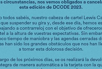 "Nos da mucha pena escribiros este mensaje, pero vistas las circunstancias, nos vemos obligados a cancelar esta edición de Dcode 2023. Como todos sabéis, nuestro cabeza de cartel Lewis Capaldi tuvo que suspender su gira. Desde ese día hemos estado trabajando a contrarreloj con el objetivo de ofreceros un cartel a la altura de vuestras expectativas. Sin embargo, el poco tiempo de maniobra y las agendas cerradas de los artistas han sido los grandes obstáculos que nos han llevado a tomar esta dolorosa situación. A lo largo de los próximos días se os realizará la devolución integra de manera automática a la tarjeta con la que comprasteis vuestras entradas. Ya estamos centrados en ofreceros el mejor cartel posible para DCode 2024. Una edición diferente que presumirá de muchas sorpresas. Una vez más queremos daros las gracias a todos vosotros por vuestro apoyo. Y, por supuesto, agradecer su participación a la Universidad Complutense, artistas, patrocinadores, medios de comunicación y al equipo y empresas que hacen posible el festival. Gracias. Nos vemos en DCode 2014″.