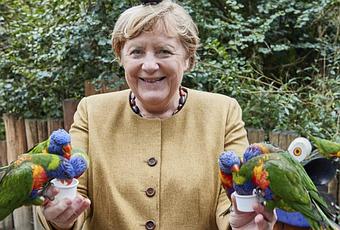 La canciller alemana Angela Markel dejó una imagen risueña que se viralizó. La líder demócrata cristiana visitó un parque de aves en el que posó junto a unos loros y dio un grito al recibir un picotazo en la mano, momento que quedó inmortalizado en una fotografía.