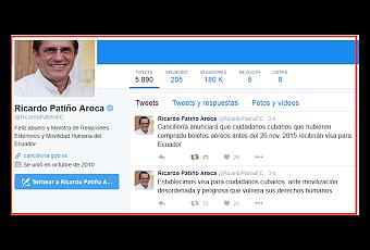 El canciller ecuatoriano, Ricardo Patiño, confirmó este sábado que los ciudadanos cubanos que han adquirido antes del 26 de noviembre de este año sus boletos aéreos para viajar a Ecuador recibirán la visa de turista que ahora exigirá el país suramericano desde el 1 de diciembre, según la agencia ANDES.“Cancillería anunciará que ciudadanos cubanos que hubieren comprado boletos aéreos antes del 26 nov. 2015 recibirán visa para Ecuador”, escribió Patiño en su cuenta de Twitter. @RicardoPatinoEC
