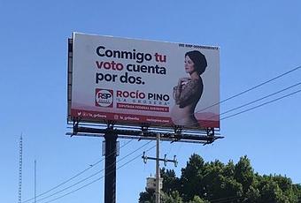 “La Grosera” ha llamado la atención con atrevidos carteles en los que aparece embarazada y desnuda con lemas como “Conmigo tu voto vale por dos”, “¿Las quieres? Te las doy” o “Una mujer con chichis es una mujer empoderada”.