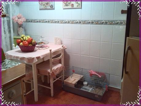 Aquí tiene su casita, pero siempre esta abierta. Todo lo hace dentro y después campa a sus anchas por casa, no mancha nada....Núnca la he cerrado!!
