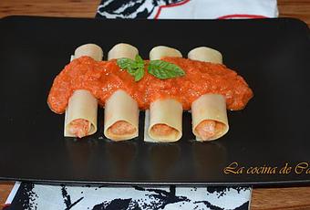 Distribuir la mezcla sobre las láminas de pasta y formar los canelones, cubrimos con la salsa vizcaína y meter al horno precalentado a 170 grados durante 10 minutos y servir.