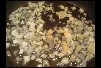 En una sartén, con un poco de aceite, pochamos la cebolla y el calabacín cortados muy menudos.