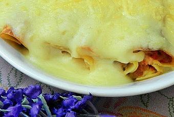 Cubrimos los canelones que habíamos colocado en la fuente con la bechamel y espolvoreamos queso rallado. Llevamos al horno durante unos 10-12 minutos a 180º o hasta que veamos el queso doradito.