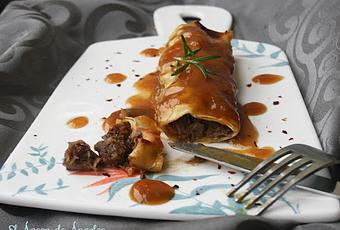 - Extiende las placas de lasaña, pon un par de cucharadas del relleno de carrilleras y pera y enrolla. Coloca en una fuente apta para el horno.