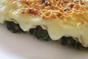 3. Añadimos en una sartén un poco de mantequilla, salteamos los piñones y las pasas, añadimos las espinacas, mezclamos bien y añadimos la harina, agregamos medio vaso de leche y las lonchas de queso. Nos debe quedar cremoso si es necesario pondremos un poco más de leche. Dejamos enfriar unos minutos.