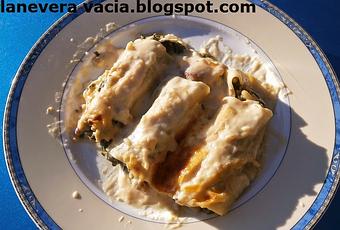 En cada placa pon una tira de jamón dulce parte del relleno y por encima un trozo de queso de cabra repartido por encima. Dales forma. Puedes hacer los canelones que necesitas o hacer de más y congelar para otra vezPon el horno a calentar a 220 ºEn una bandeja para horno cubre el fondo de esta con una capa de bechamel.Unas lonchas finas de queso. Por encima pon los canelones de espinacas y cubrelos con la bechamel. Encima de la bechamel pon unas lonchas de queso y unos trozos de mantequilla ( para que quede bien gratinado).Pon en el horno a calentar y gratinar.Cuando veas que ya está sacar del horno y ya se pueden servir.Espero que os guste y que aproveche.conlaneveravacia.blogspot.com[email protected]