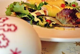 Para presentar el plato, ponemos una base de lechugas encima 3 canelones por persona, distribuimos la granada y aliñamos con la vinagreta de mango.