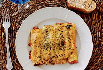 3. Rellenamos cada placa de canelones con el sofrito, enrollando cada canelón sobre si mismo. Vamos colocando cada uno sobre una fuente de horno.