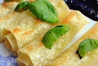 - Cortar tiritas de queso brie (u otro que funda bien), del ancho de las placas, retirando la corteza. Poner una tirita de queso sobre cada lámina y media nuez cortada a la mitad. Enrollar y poner en una fuente untada de aceite. Gratinar un minuto en el horno hasta que el queso se funda.