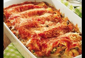 Engrase un molde . Ponga un poco de relleno en los trozos de masa , enróllelos y colóquelos en el molde. Eche sobre los canelones la salsa de tomate que ha reservado y espolvoree por encima el queso rallado. Gratine en el horno durante unos 30 minutos, hasta que se dore.