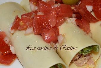 Lavamos las judías verdes bajo el grifo, las cortamos en diagonal a una anchura de 3 o 4 milímetros, las hervimos con agua y sal durante 5 minutos aproximadamente. Las sacamos, escurrimos y las dejamos enfriar.Cocemos los huevos en un cazo con agua y un poco de sal durante 10 minutos. Los sacamos, refrescamos bajo el grifo y los pelamos con cuidado.Hervimos la pasta en una olla con abundante agua y sal hasta que la notemos al dente. Las dejamos enfriar y las colocamos bien planos sobre un paño limpio de cocina.Mezclamos las judías, el atún, las aceitunas picadas y los huevos también picados. Distribuimos sobre los canelones y enrollamos cada uno de ellos.