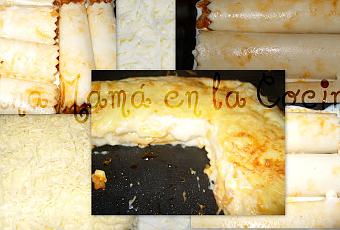 * En una bandeja para horno poner un poco de bechamel, ir rellenando las placas con cantidades pequeñas de carne para poder hacer forma de rulo-canelón, ponerlas todas juntas y volver a echar toda la bechamel por encima, repartiendo por todos los rincones y terminar cubriendo de muuuuchooo queso rallado, uhmmmmm.....