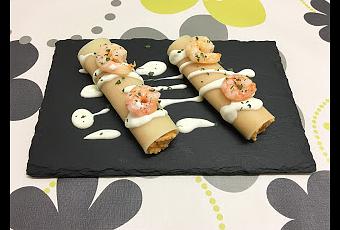 Hoy os traemos un plato principal ligero y muy distinguido que podéis preparar para ocasiones especiales, se prepara muy fácilmente y es muy resultón. ¡Seguro que a vuestros invitados les encantan!Ingredientes para 2 personas:- 6 placas de pasta para lasaña- 1 paquete de pintxo de marisco de Aguinamar- 24 gambas cocidas- 1 huevo- Aceite de oliva- Sal- Perejil picadoReceta:- En una olla grande con agua hirviendo y una pizca de sal, cuece las placas de lasaña durante el tiempo que indique el fabricante (en nuestro caso, 8-10 minutos).- Corta en trocitos pequeños 12 de las gambas que tenías, las demás, resérvalas enteras.- Mezcla las gambas cortadas con el pintxo de marisco.- Cuando las placas de lasaña estén cocidas, introdúcelas en un bol grande con agua muy fría y déjalas un par de minutos para que se corte la cocción y no se peguen.- Escúrrelas y coloca 2 cucharadas de relleno en un extremo de cada placa y enróllalos.- En un vaso apto para batidora, introduce el huevo y un buen chorro de aceite.- Comienza a batir sin levantar la batidora del fondo y añade poco a poco de forma continuada más aceite hasta que se forme la mayonesa.- Lo ideal que es que tenga una textura ligera.- Emplata los canelones y vierte por encima la mayonesa.- Coloca dos gambas de las que habías reservado sin cortar sobre cada canelón.- Espolvorea un poco de perejil picado por encima.
