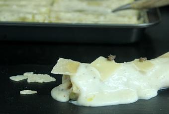 Prepara la bechamel, añade 1 cdta. de la trufa triturada o cortada en trozos pequeños. Cubre los canelones, intenta que queden suficientemente cubiertos, ya que los canelones deben de cocerse. Introduce en el horno que has precalentado a 180º durante 35-40 minutos o sigue las instrucciones del fabricante.