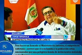 La nota televisa resume que en los últimos meses los homicidios y ajustes de cuentas, cubiertos por un halo de misterio y un signo de interrogación que la justicia no puede explicar, son la noticia del día.A través del programa “Domingo al Día” – el Sub Prefecto, Jorge Brignole Santolalla – reveló existe una poderosa mafia integrada por autoridades del Centro Poblado Nuevo Ayacucho que están inmersas en la venta ilegal de lotes de terrenos de propiedad del Estado peruano.Brignole- precisó que los crímenes que hoy se registran en Cañete- son consecuencia del ilícito comercio de terrenos en la zona de Nuevo Ayacucho – dentro de las denominadas Pampas de Concón. “Cañete esta que quema y es fuego en estos momentos. Hay muertes, tráfico de tierras, tráfico de drogas y hay injerencia de gente que ha venido del exterior como grupos de colombianos que hoy están por acá”, continuó diciendo tras acotar que quien está detrás de estos hechos ilegales – tiene abierta una investigación por el presunto delito de lavado de activos en agravio del Estado peruano y delito contra el patrimonio.Tras hacer un llamado al Ministerio del Interior, el subprefecto cañetano – aseveró que él y su familia y la población están amenazados por una peligrosa banda de delincuentes instalada en las Pampas.Por ultimo –lamentó que el Gobierno este permitiendo abiertamente que llegue gente a Cañete a lucrar ilícitamente, se lleve el dinero, asesinen y no pase nada.
