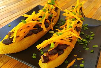 - Cortamos y abrimos los plátanos a lo largo haciendo una especie de barquito. Rellenamos las canoas primero con el arroz integral y después con las judías negras.