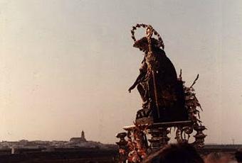 La letra de la popular sevillana de Manolo Garrido en la década de 1960, parece augurar la estampa que se produjo durante la romería de 1985 y que hoy traemos a la sección de Memoria gráfica de nuestro blog. Aquel año se pernoctó por primera vez en los Pajares y antes del amanecer la Divina Pastora salió a hombros de sus hijos e hijas por las calles de la aldea recién construida, la procesión se prolongó hasta la Misa de Romeros la mañana del domingo, en esta ocasión presidida por Monseñor Amigo Vallejo con motivo del XXV aniversario de la Ermita. Al llegar al extremo sur de la aldea, con las primeras luces del día, la silueta de Cantillana se dibujaba en el horizonte mientras que la Pastora miraba a su pueblo.
