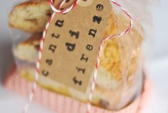 I didn’t like the packaging, so I decided to customized it. i bought some craft paper in a very famous paper shop. I made a kind of basquet with the paper to place the cantucci’s bag and I put a tag with bake twine. And here you have the result.