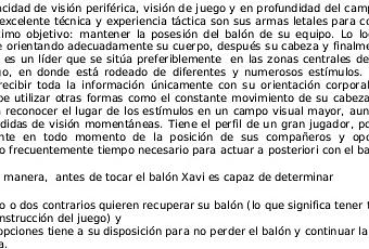 LOS BENEFICIOS DE UN ENTRENAMIENTO DE LASCAPACIDADES VISUALES POR UN FUTBOLISTA El secreto del buen juego de Xavi Hernández Cuando el jugador del FC Barcelona Xavi Hernández (mejor jugador de la Copa de Europa de 2008) recibe el balón raramente siente presión, estrés o tiene mucha prisa, ya que antes de recibirlo ha procesado en su cabeza toda la información necesaria de la que precisa para saber qué hacer. Su capacidad de visión periférica, visión de juego y en profundidad del campo junto con su excelente técnica y experiencia táctica son sus armas letales para conseguir su próximo objetivo: mantener la posesión del balón de su equipo. Lo logra casi siempre orientando adecuadamente su cuerpo,