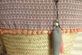 Tela preciosa étnica, madroño color coral y, para darle un toque playero le hemos puesto un pescadito de lino gris con una borla color coral...