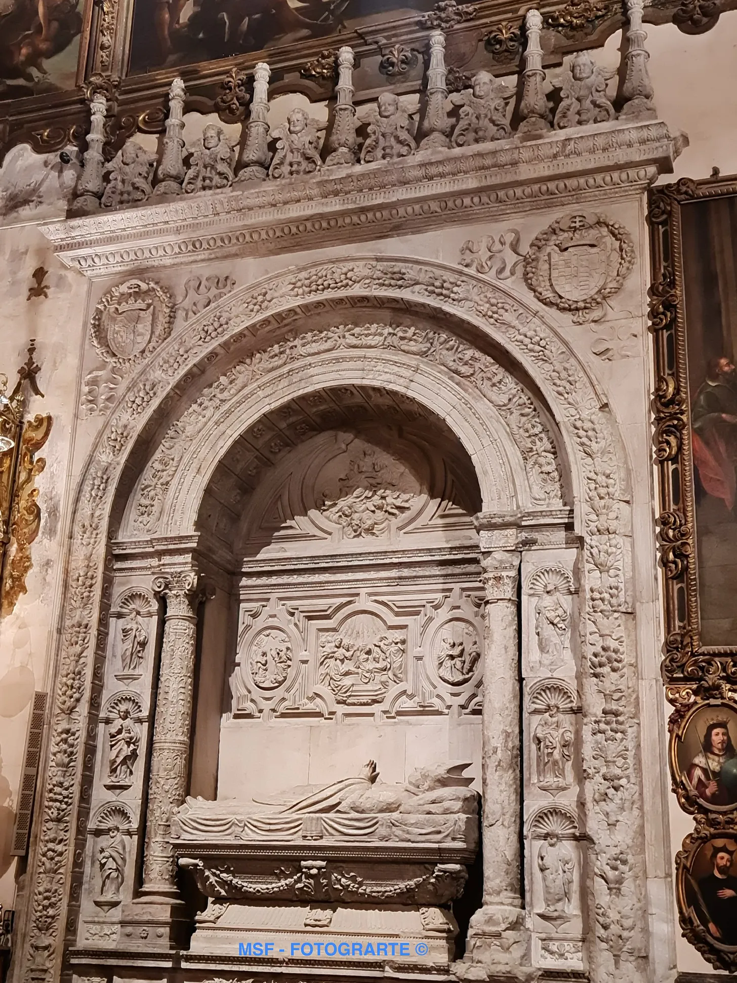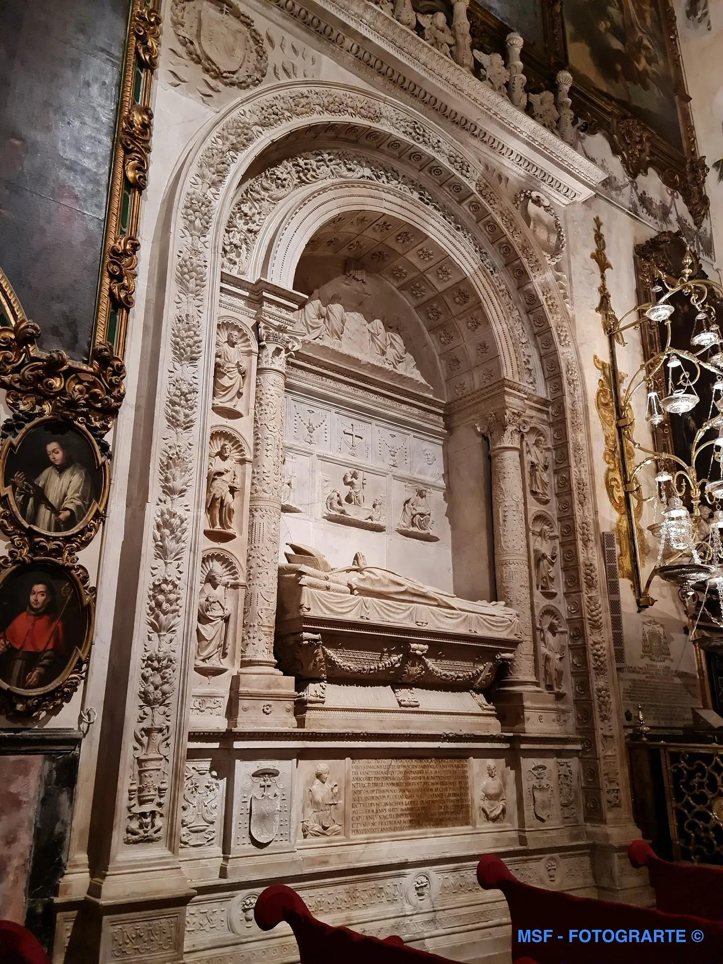 En el lado izquierdo de la capilla, se ubica el magnífico enterramiento del Cardenal Diego Hurtado de Mendoza y Quiñones, nieto del marques de Santillana y uno de los máximos apoyos, como arzobispo de Sevilla, de la corriente temprana del humanismo cristiano renacentista (finales siglo XV). / On the left side of the chapel is the magnificent tomb of Cardinal Diego Hurtado de Mendoza y Quiñones, grandson of the Marquis of Santillana and one of the greatest supporters, as Archbishop of Seville, of the early movement of Renaissance Christian humanism (late 15th century).