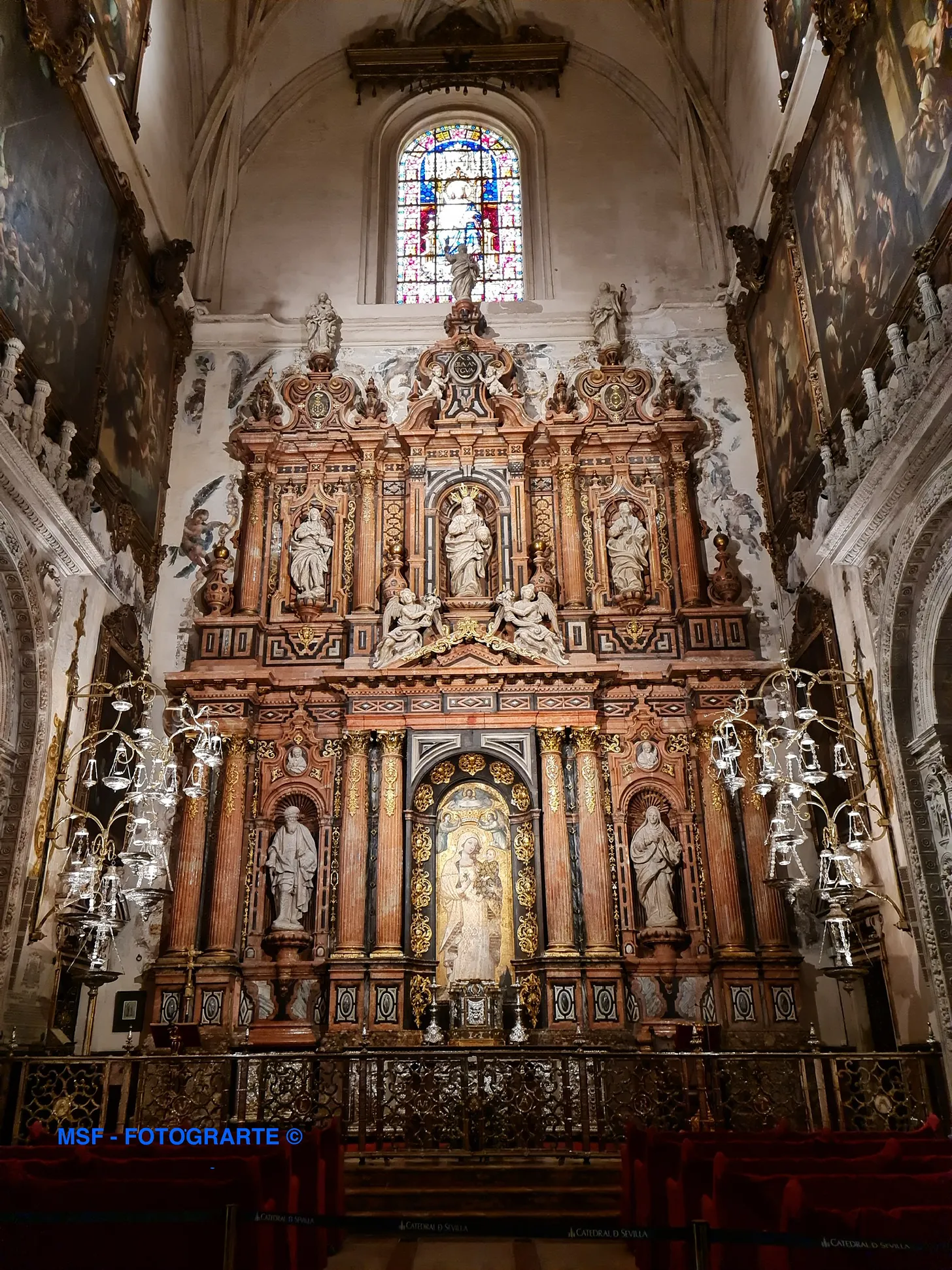 Vista general del retablo, que preside la capilla, con el fresco llamado “de la Virgen de la Antigua”. / General view of the altarpiece, which presides over the chapel, with the fresco called “of the Virgin of the Antigua”.
